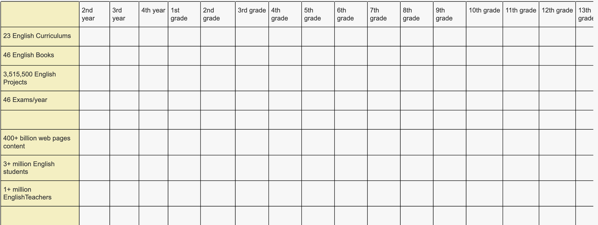 - The data: expected and defined English curriculums, approved books, projects, approved exams